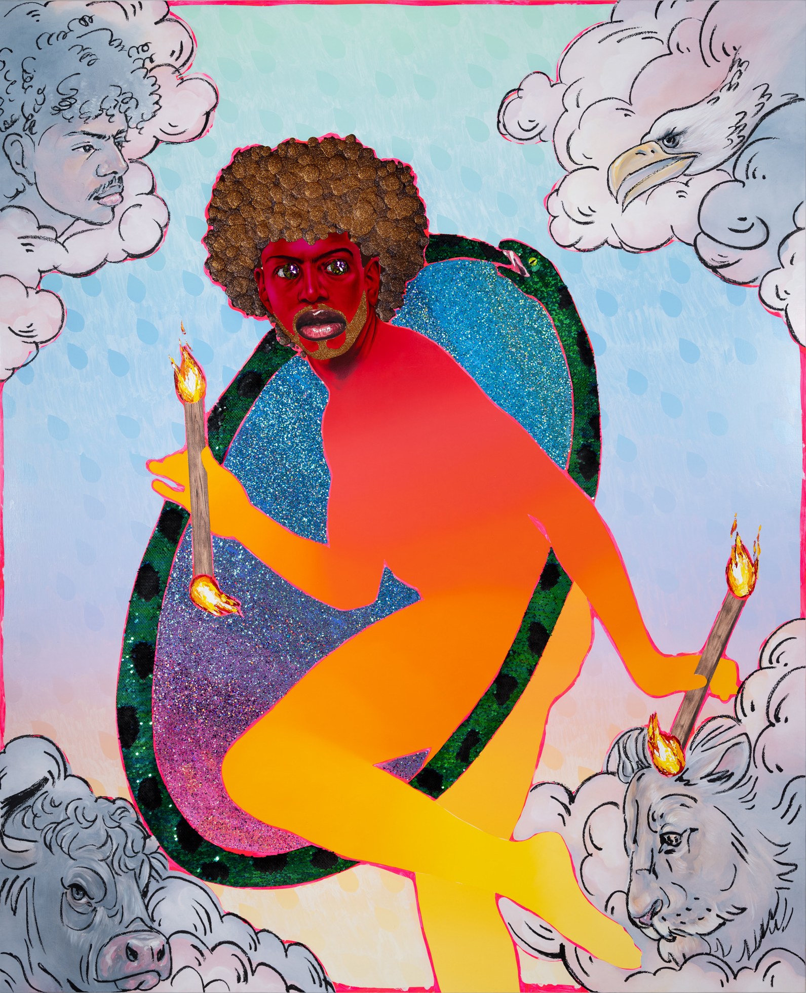 Devan Shimoyama, Le Monde, 2024. Oil, colored pencil, glitter, Flashe, collage, sequins, and Swarovski crystals on canvas stretched over panel, 84 × 68 in. (213.4 × 172.7 cm). Courtesy of the artist and De Buck Gallery